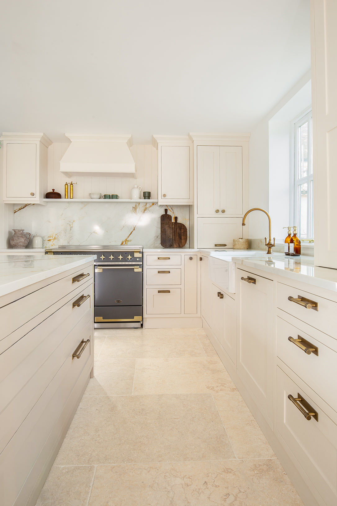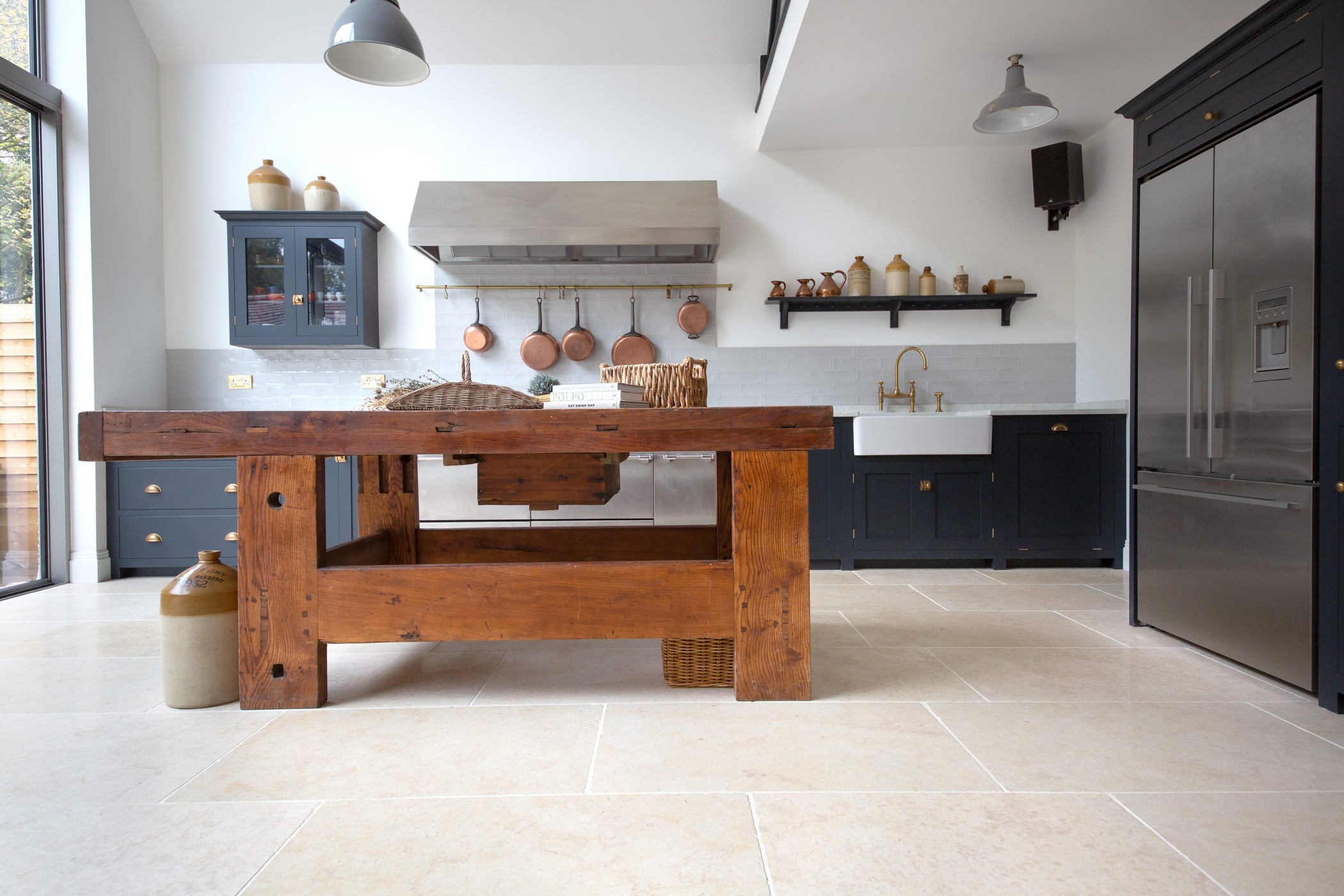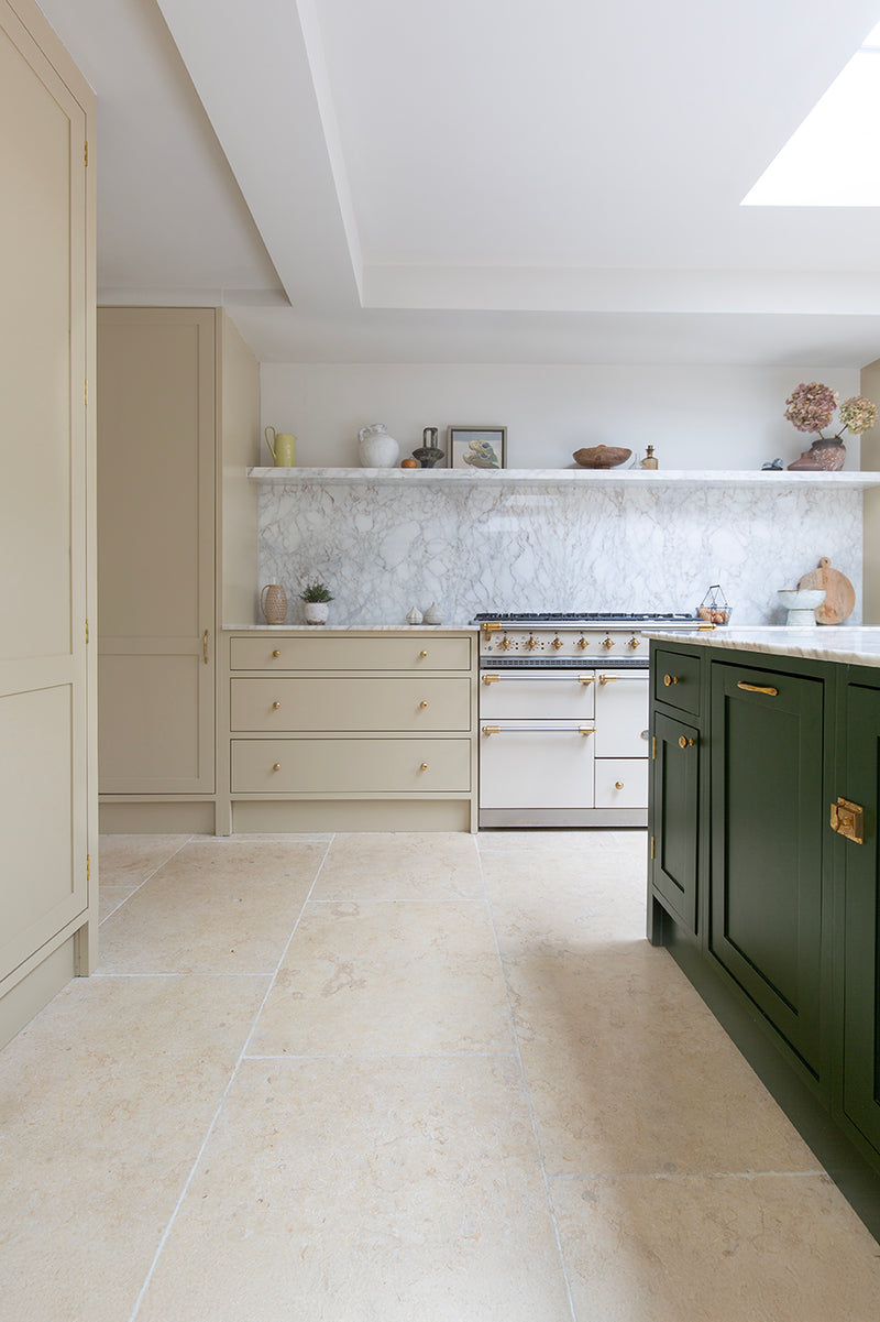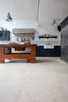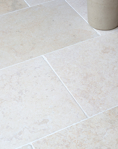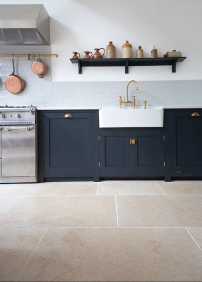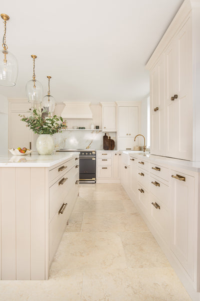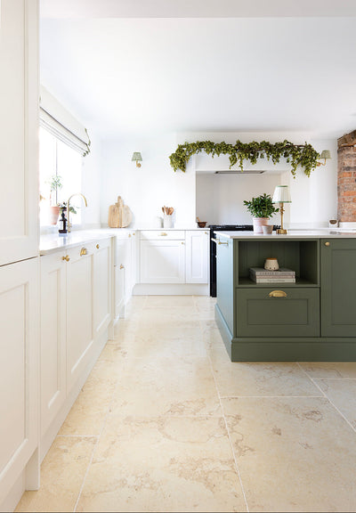 The Monte Carlo tumbled limestone tiles are an ever-popular kitchen floor tile that offers honey beige to cream tones with warm rustic detailing, veining and intricate fossils. This limestone tile gives the appearance of an aged traditional flagstone floor, perfect for country homes and kitchens. Its fine details are complemented by soft golden tones and pale grey hues that blend together within each tile.
