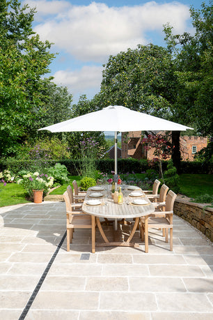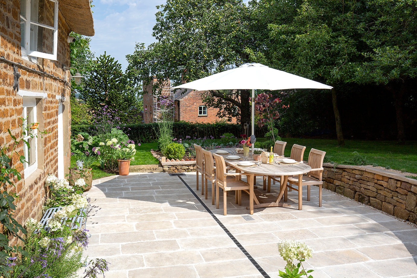 The Sorrento aged tumbled limestone paving is a classic beige toned outdoor tile in a tumbled finish with subtle tonal variations throughout. The varying beige and honey hues within this stone blend effortlessly, with cooler undertones in soft fossil details. This beige neutral toned natural stone paver complements an array of garden schemes, whilst its aged-tumbled finish and natural fossil appearances, offer unique texture and detail within each limestone patio tile creating an aged, lived in appearance.