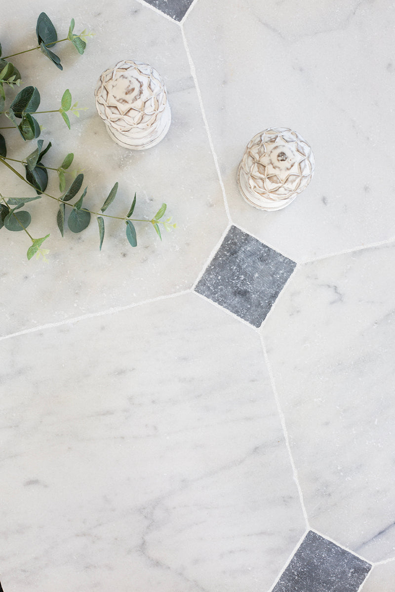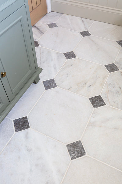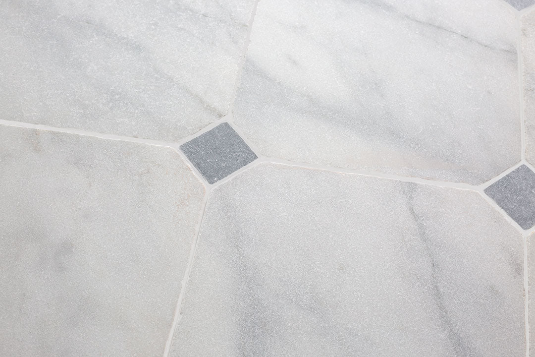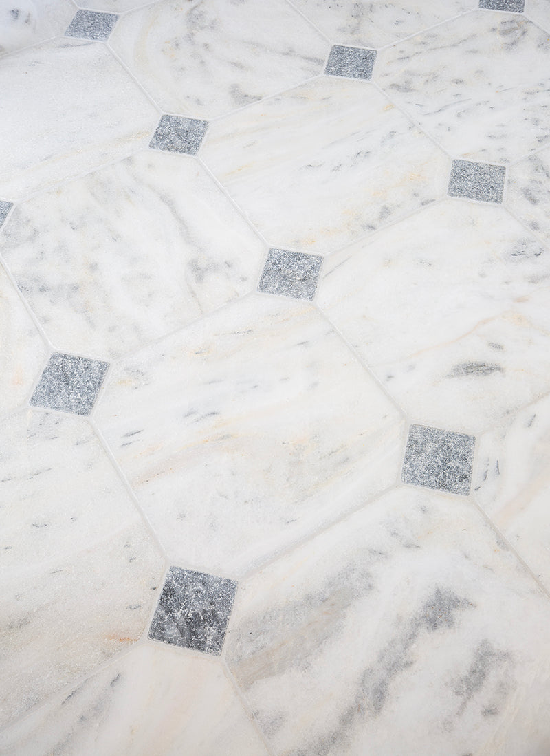 The Parisian Manoir tumbled marble tiles feature beautiful white and grey hues and contrasting grey cabochon inserts. This tumbled marble is an elegant tile, gracing hallways, entrance rooms and bathrooms alike.