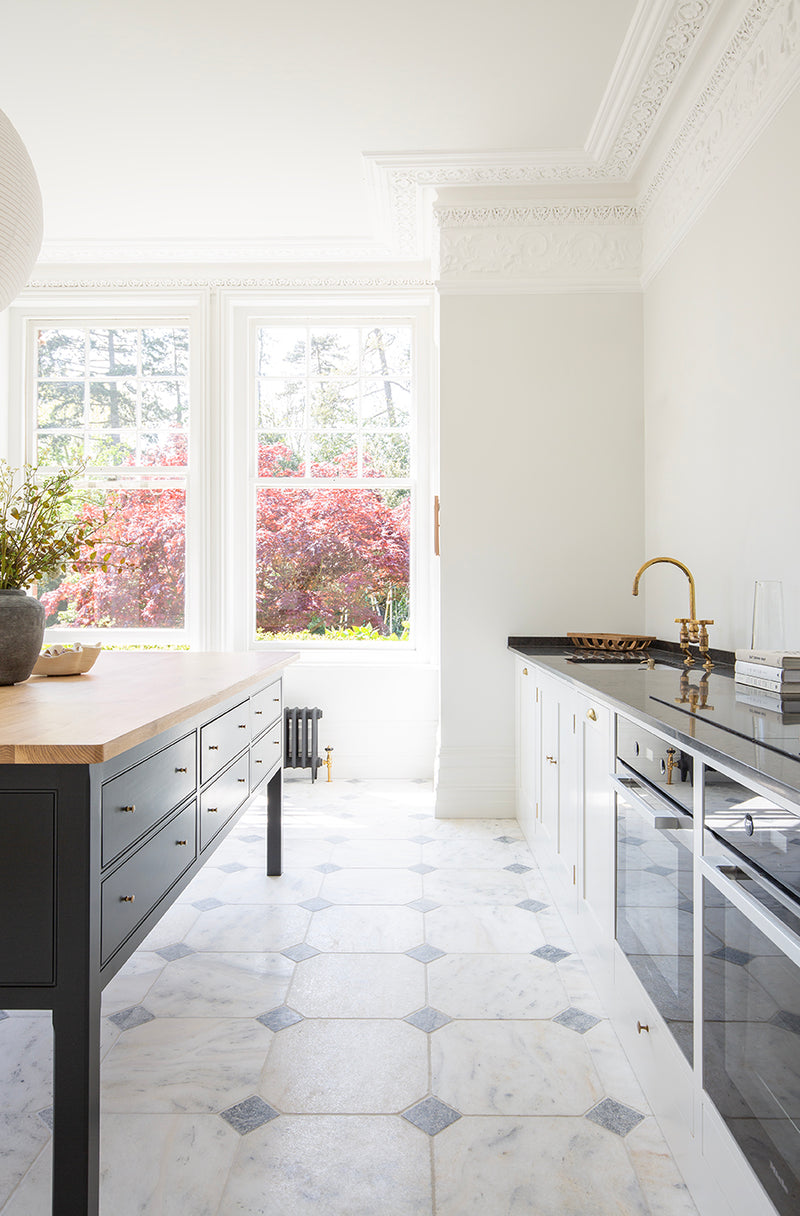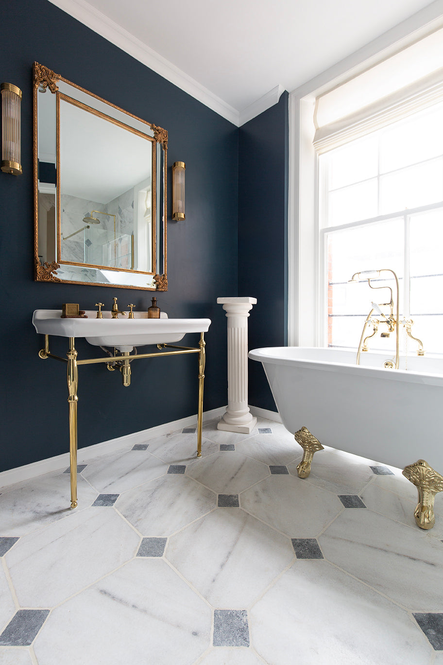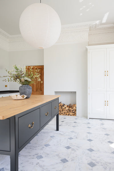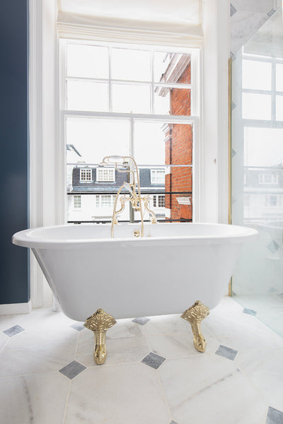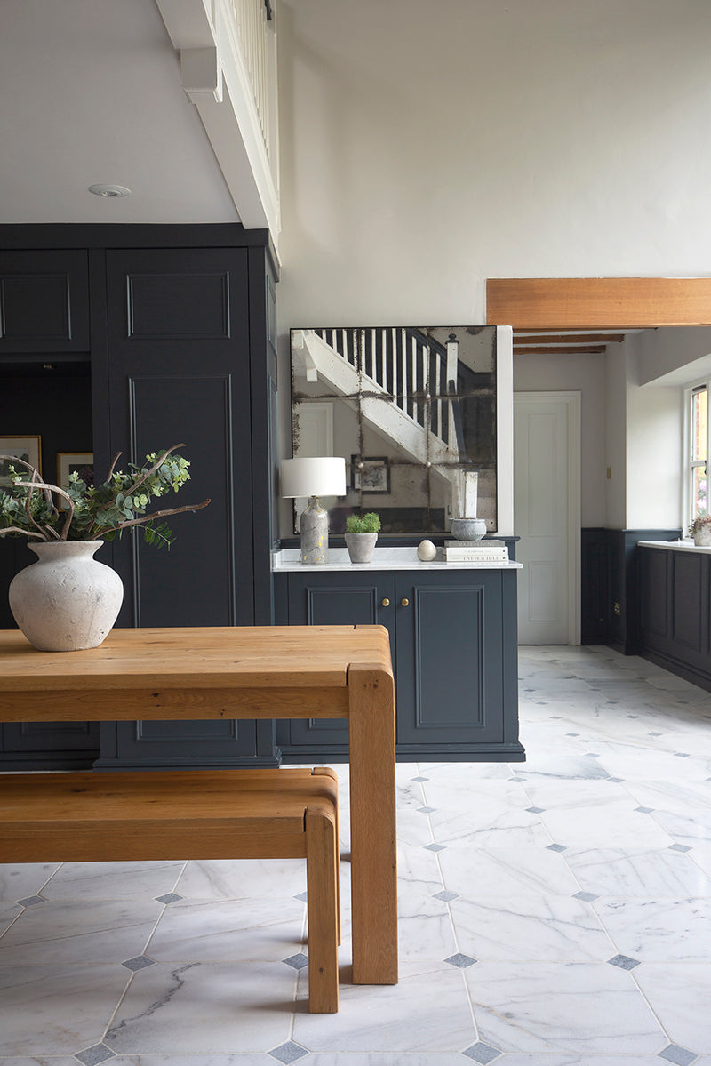The Parisian Manoir tumbled marble tiles feature beautiful white and grey hues and contrasting grey cabochon inserts. This tumbled marble is an elegant tile, gracing hallways, entrance rooms and bathrooms alike.