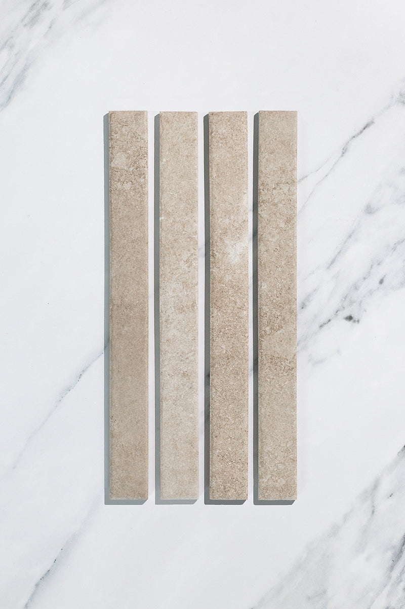 The Castello Stone offers a porcelain take on popular herringbone brick tiles in a soft grey elongated brick format with a tumbled effect edge. This stone effect porcelain realistically mimics the beauty of natural stone, offering timeless appeal and durability. The Castello is in a 380 x 38mm size, that can be installed in various laying patterns, including as herringbone tiles. It's versatile format makes it ideal for kitchens, bathrooms or hallways.