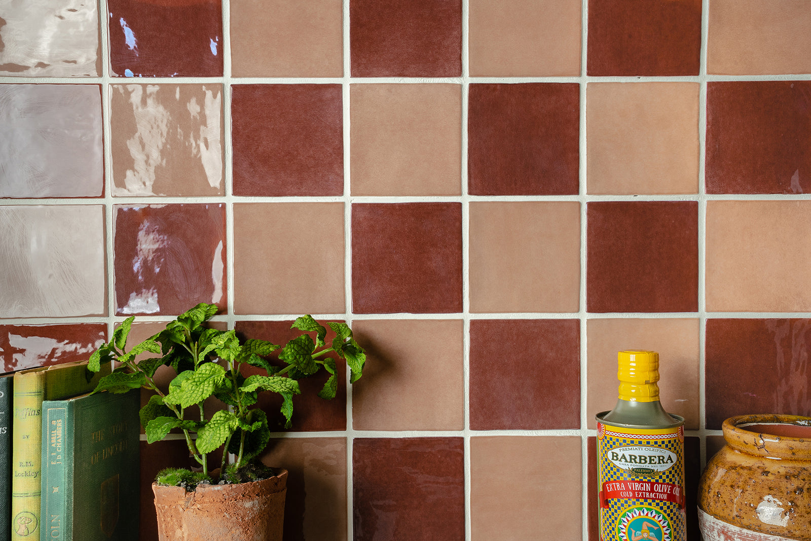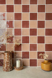 The Farini Chequerboard pairs Farini Cinnamon with Farini Plaster to create a striking feature, ideal for bathroom walls or kitchen splashbacks.