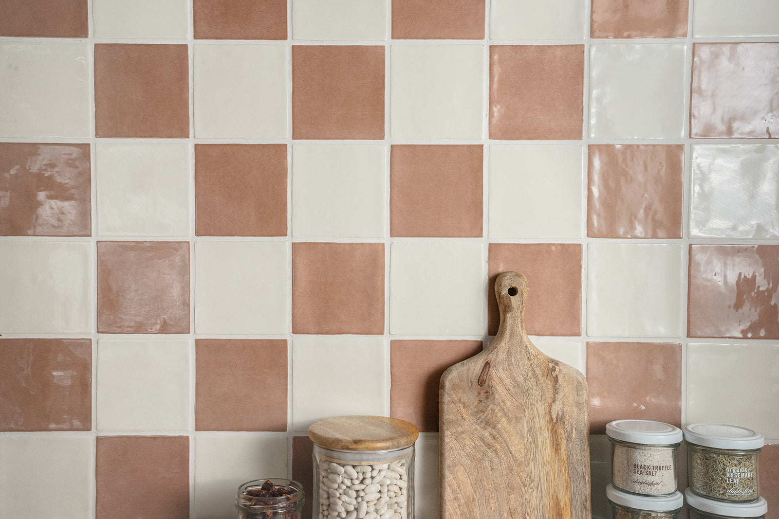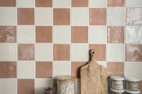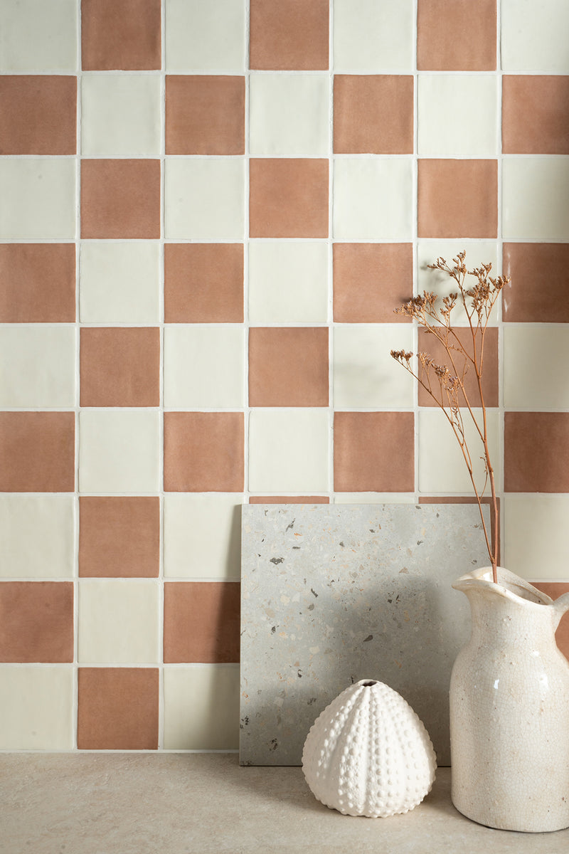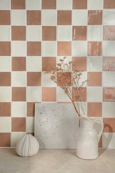 The Farini Chequerboard pairs Farini Chalk with Farini Plaster to create a striking feature, ideal for bathroom walls or kitchen splashbacks. Farini Plaster is an earthy pink mimicking the tones of raw plaster in a gloss finish inspired by Zellige...