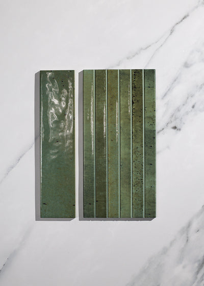 Nori Forest is a rich green with beautiful variation in a popular fluted tile. The Nori collection of glossy decorative tiles offer a range of four different shades in both metro tiles and kit kat tile formats. Nori Forest is a gloss decorative tile perfectly suited for bathroom tiles, shower tiles and kitchen splashback tiles. Please note, the kit kat format is a 125 x 250mm tile and not individual pieces - we recommend using Kerakoll Color Stain Resistant Grout in Moss (#19) for a seamless finish.
