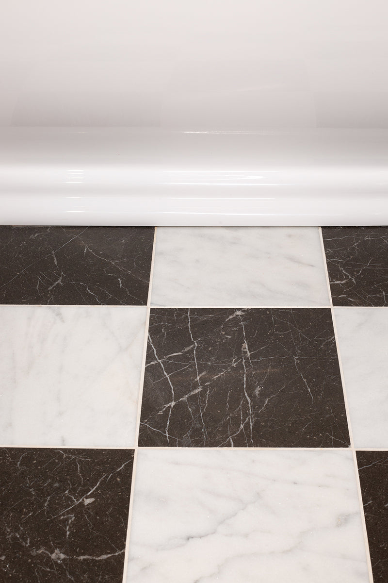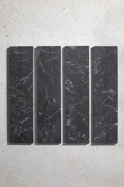 The Riviera Black honed marble tiles are a striking black with intricate white and grey veining. The tiles have a smooth, honed surface with straight cut edges, making them perfect for a variety of different spaces, from classic hallways to timeless bathrooms. The Riviera range is available in four beautiful shades; from black and white, to burgundy and emerald. The Riviera Black can be laid by themselves or combined with other shades for a classic chequerboard tile look. Also available as a decorative metro tile.